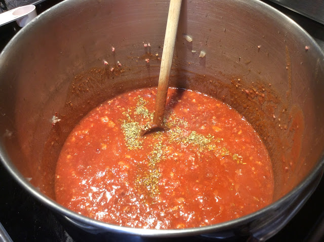 ADD the Tomato Sauce and puree. (we used Tomato Puree and Home canned Tomato Sauce)